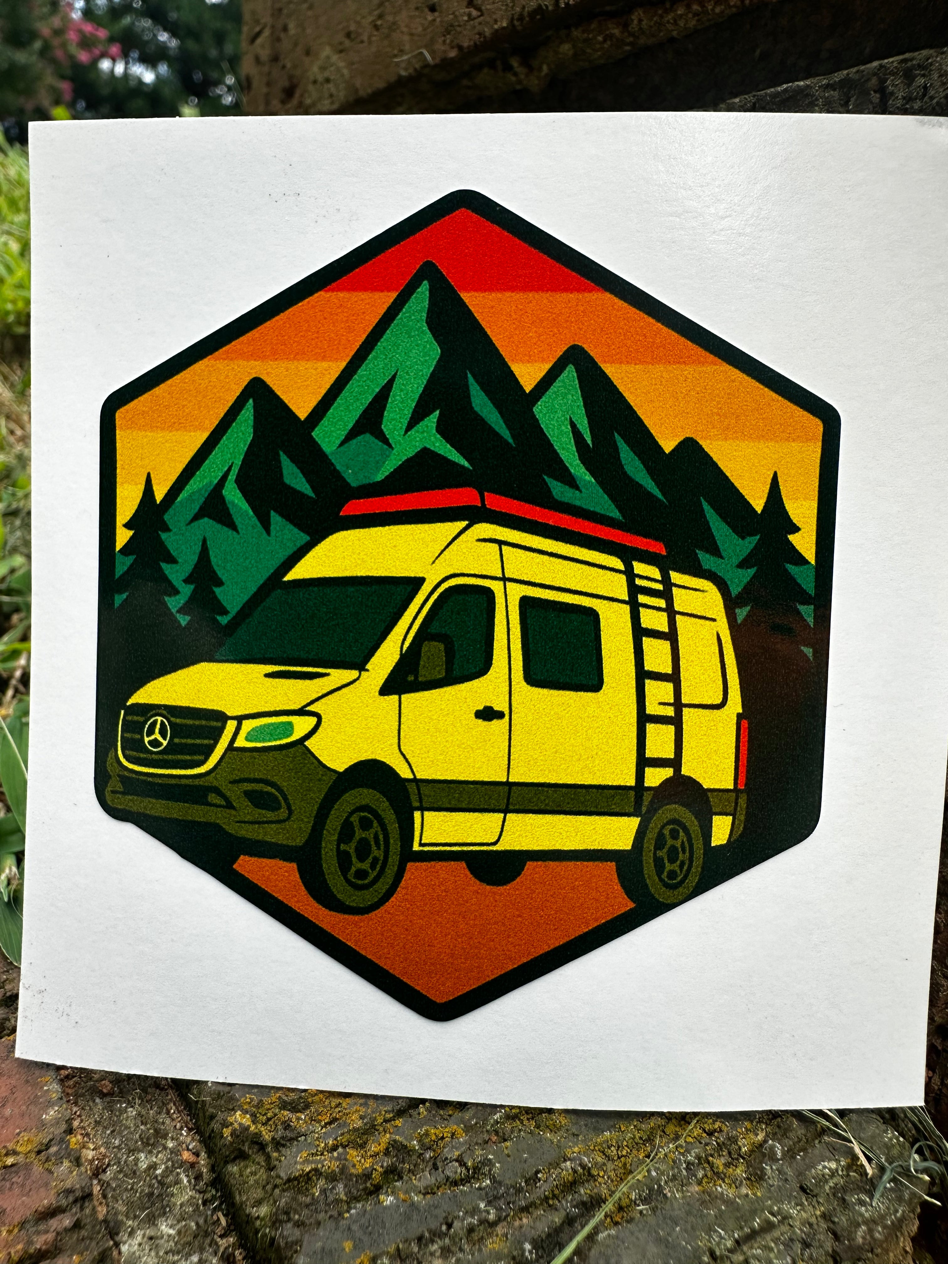 🚐 Hit the road in style with this REVEL Camper Van decal!Featuring a retro mountain backdrop and a bold sunset...